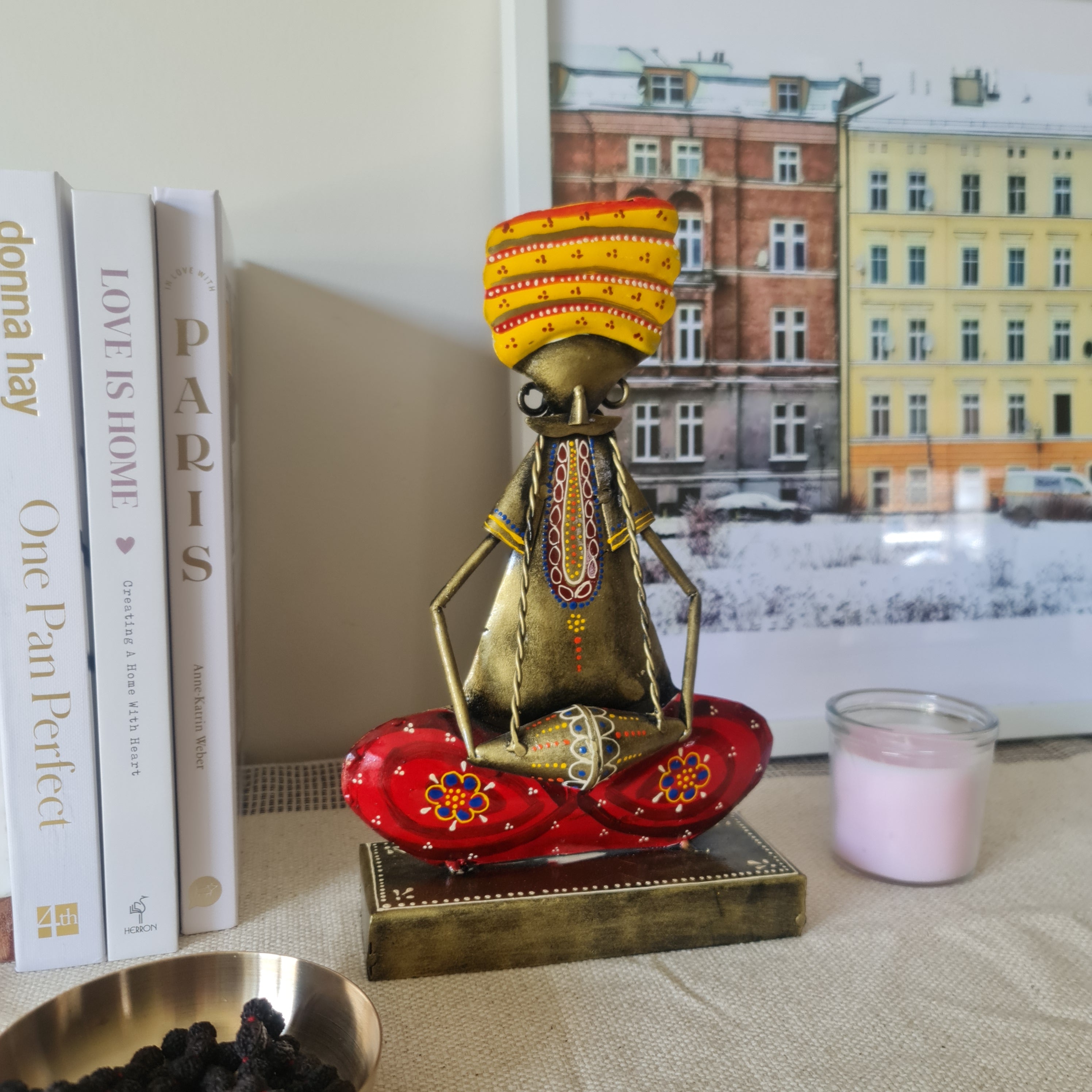 This handcrafted decorative showpiece draws inspiration from the lively art, dance, and music of Rajasthan's tribal and local communities. Featuring a tribal musician wearing a traditional pagdi and playing a classic Indian instrument, this unique curio adds a cultural flair to any space. It beautifully captures the rich heritage of Rajasthan, making it a perfect centerpiece for your home décor.