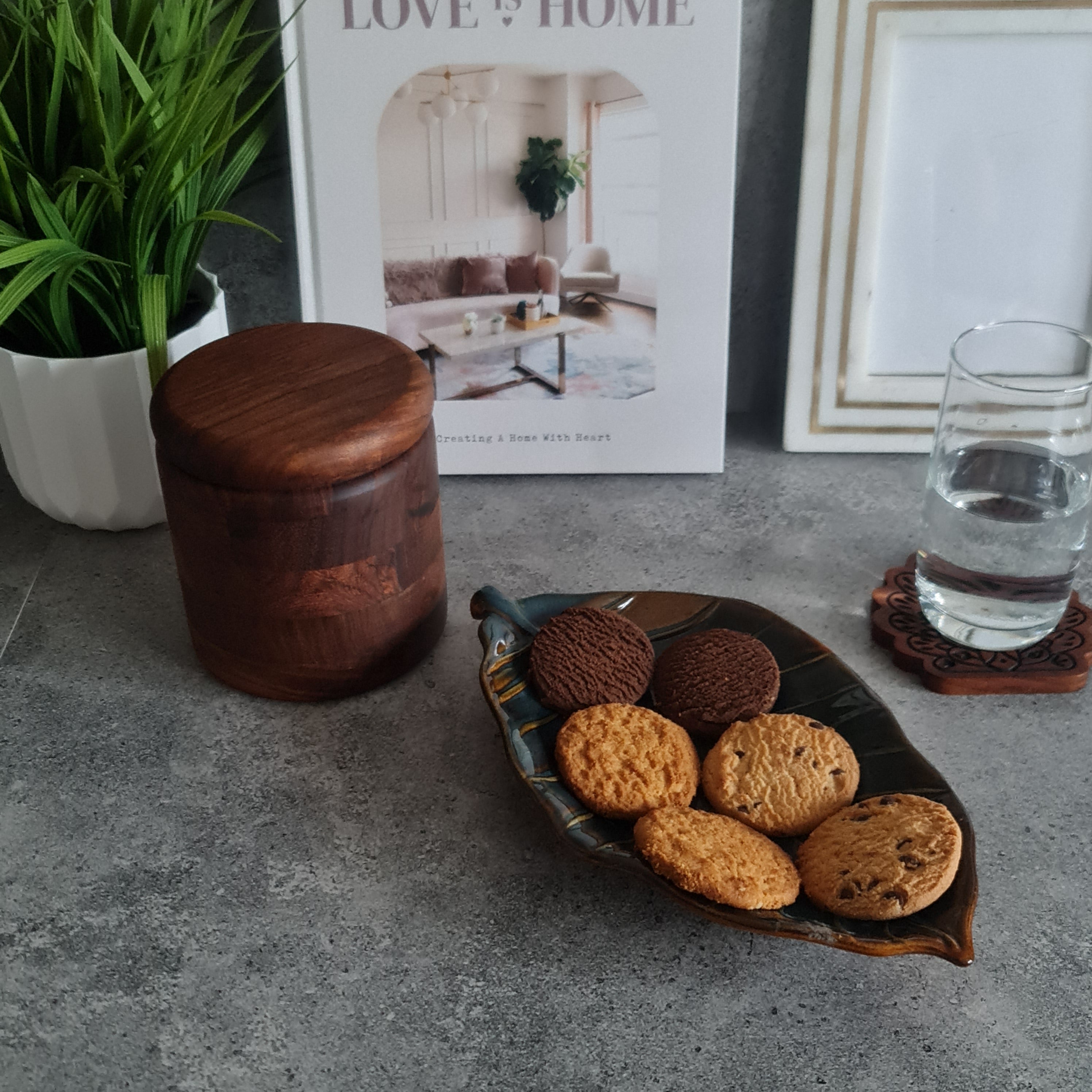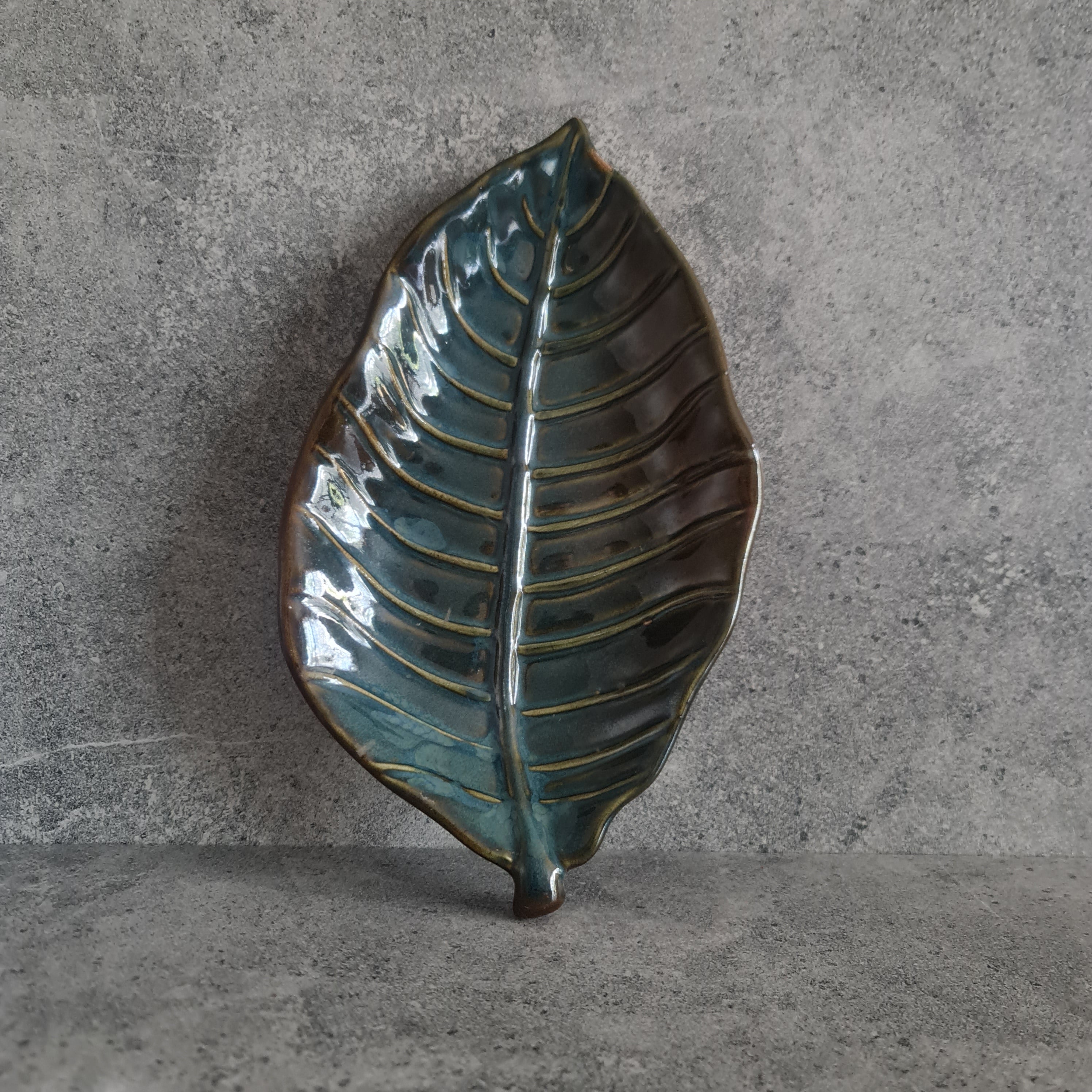 Handcrafted by Indian artisans, this ceramic serving platter is ideal for serving appetizers, snacks, fruits, and more. Double-fired at 1200°C and hand-glazed, this decorative tray features a stunning dual-tone design with a glossy leaf pattern. This versatile tray can be used as a serving tray, decorative tray or plate, adding an elegant touch to any table setting.